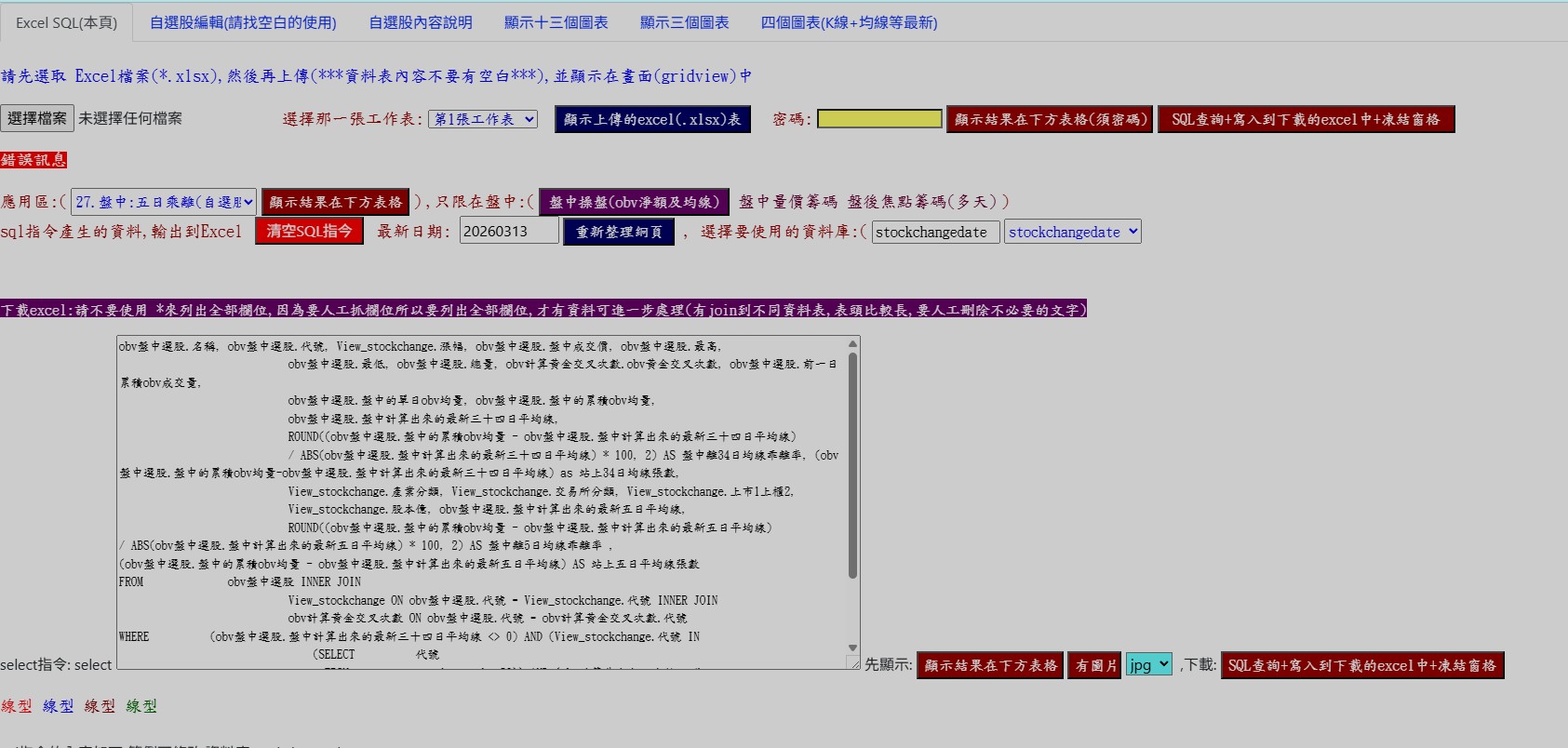 股神資料查詢(首頁上方有超連結) 1.修改內容按鍵:匯入的圖片自行逐一更改為正確的股票代號(完成之後才能抓到正確股票名稱) 2.可以列出1.全部或2.紅六星+法人或3.紅五星加法人等等,也可以直接按紅六+法人統計(統計為2係兩者都有) 3.其他方式查詢:範圍(要輸入起訖號碼)或按日期或按種類 http://220.134.245.185:8888//lookpicture/stockgod.aspx 更新版:http://220.134.245.185:8888/fishnew5/stockgodpc3.aspx http://220.134.245.185:8888/fishnew5/stockgodpc1.aspx