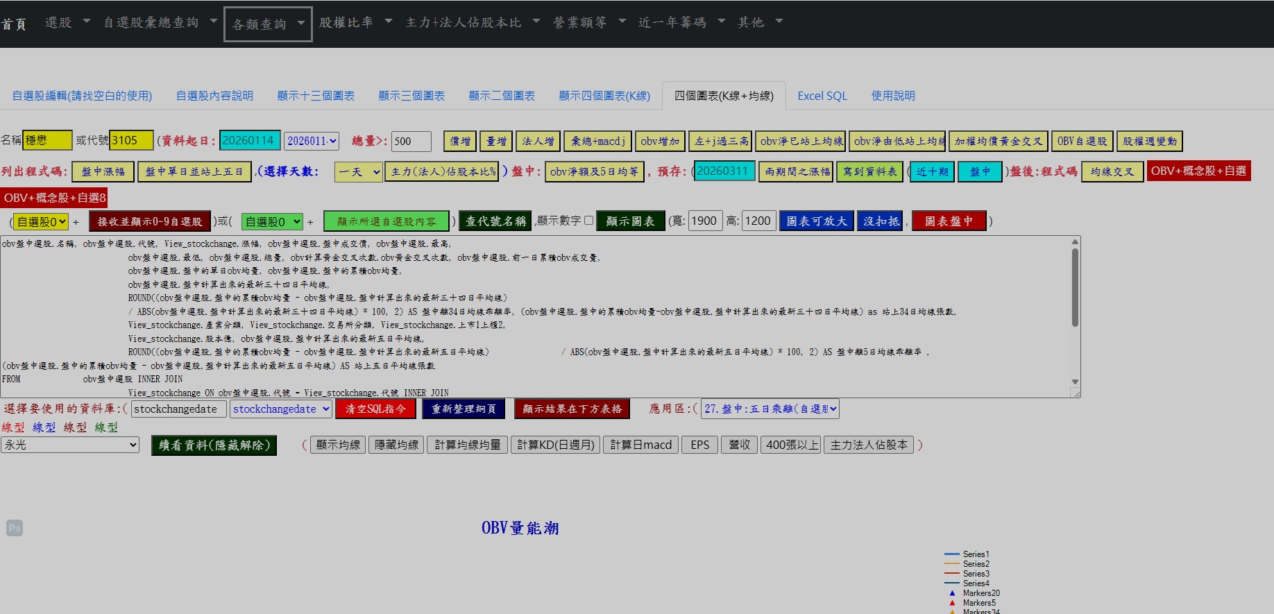 OBV量能潮,部份內容如下:http://220.135.3.78:8888/mymvc/sop.aspx,右邊有使用說明 http://220.135.3.78:8888/mymvc/trend4stock1.aspx
