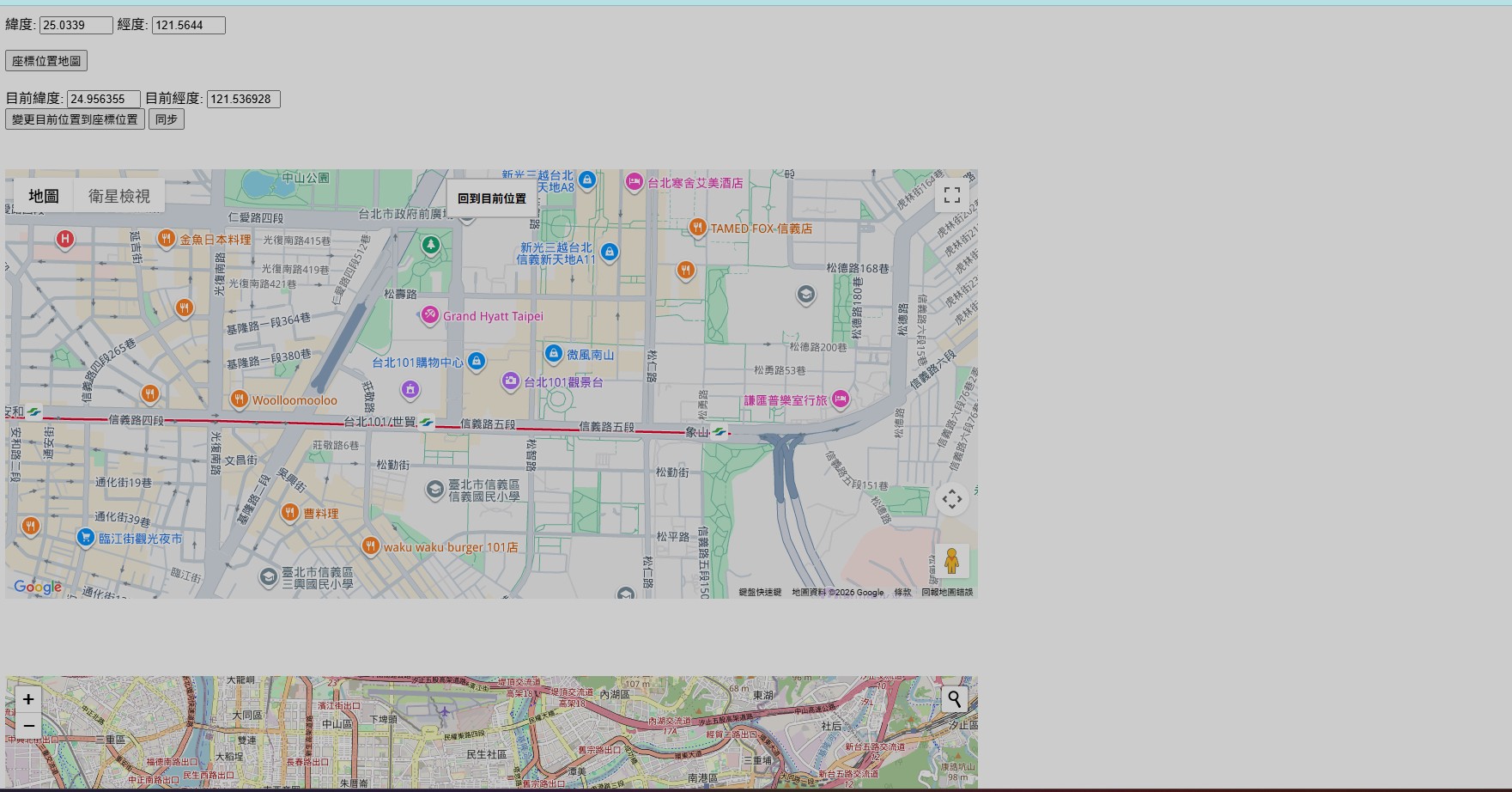 1.使用github的加密網頁來顯示目前定位並可隨時將座標建檔到資料庫(可編輯及刪除及新增) 2.按同步可將檔案傳送到免費的Somee網頁接收,便可24小時使用 2.可顯示定位的變動,下方的地圖可使用免費的地圖目標查詢,資料連動上方座標 https://weizen99.github.io/androidapp/map.html