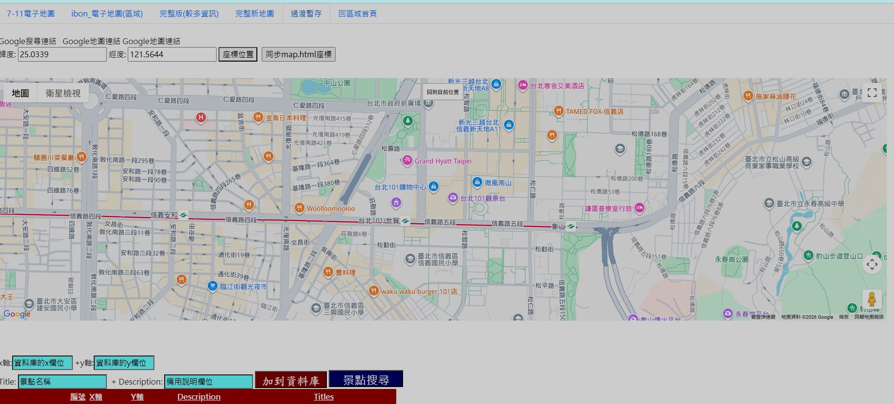 按同步到map.html座標,便可將傳送的座標顯示到此網頁,輸入Title:景點名字及備註,按加到資料庫便可建檔至資料庫中, 也可以自己進行新增修改刪除 http://www.hacker1.somee.com/map?x=24.956355&y=121.536928